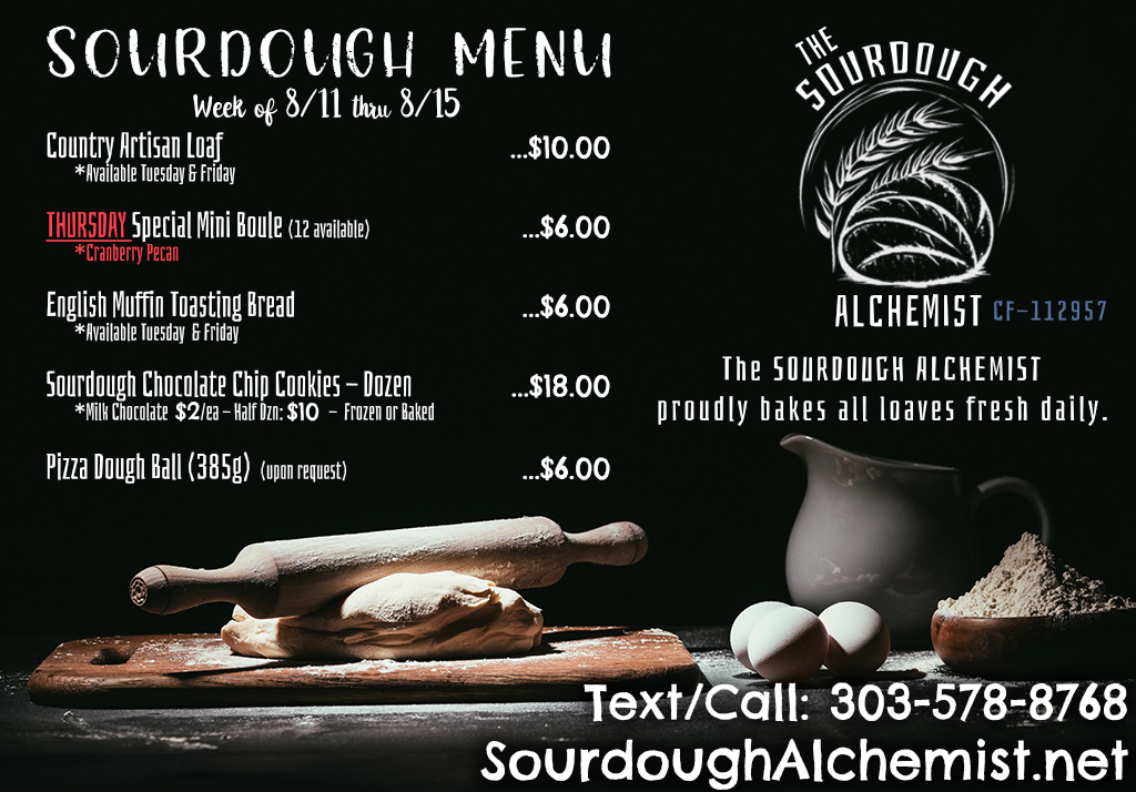 To order, either comment below, Contact me HERE, or text me at 303-578-8768. Tell me what day you’d like a loaf, and I’ll confirm with you by the same method of contact.