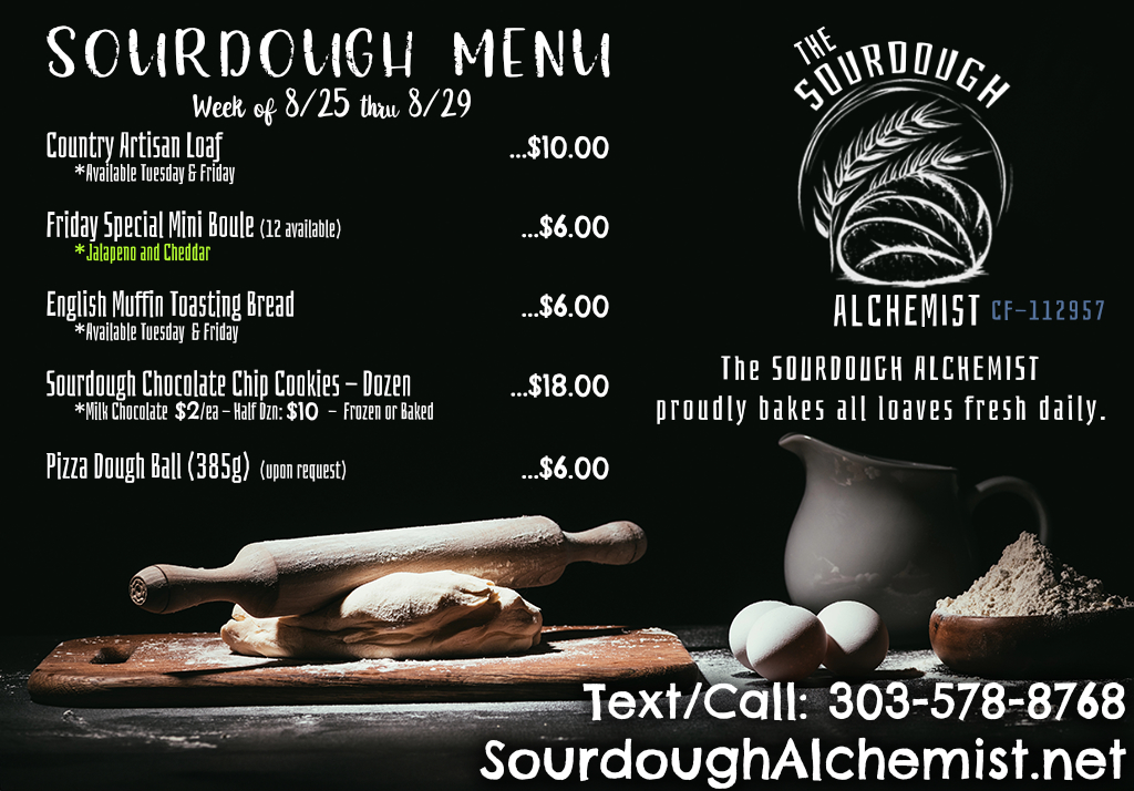 To order, either comment below, Contact me HERE, or text me at 303-578-8768 (preferred). Tell me your name, which day you’d like a loaf, and I’ll confirm with you by the same method of contact.