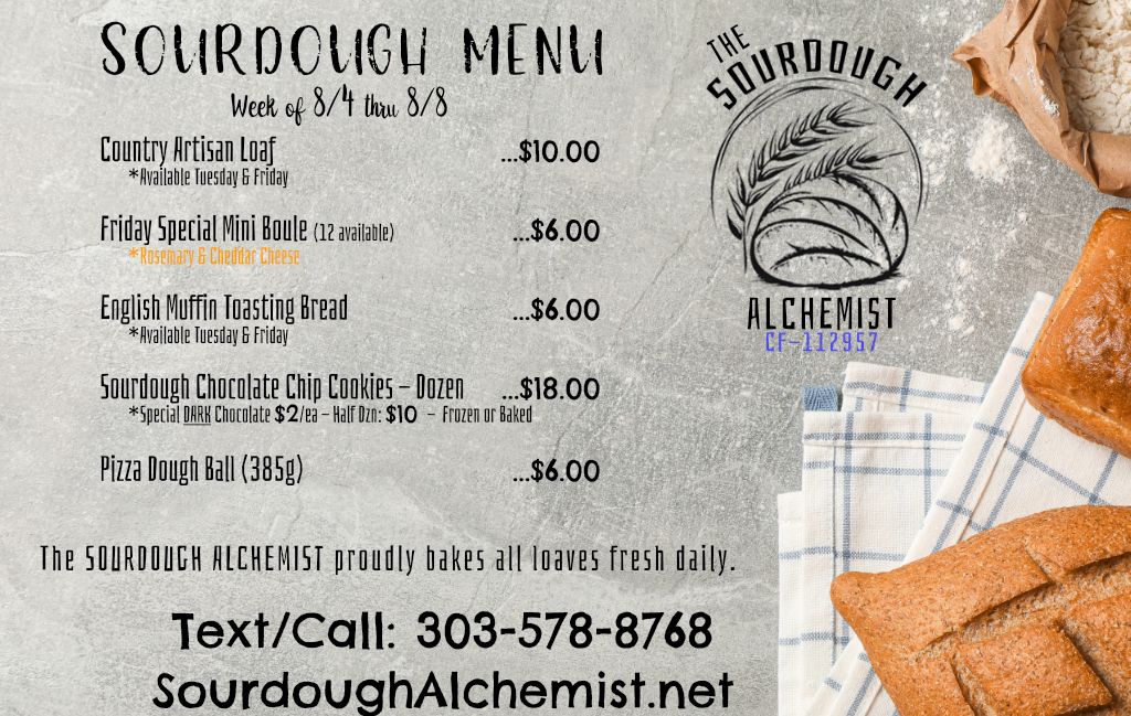 To order, either comment below, Contact me HERE, or text me at 303-578-8768 (preferred). Tell me your name, which day you’d like a loaf, and I’ll confirm with you by the same method of contact.