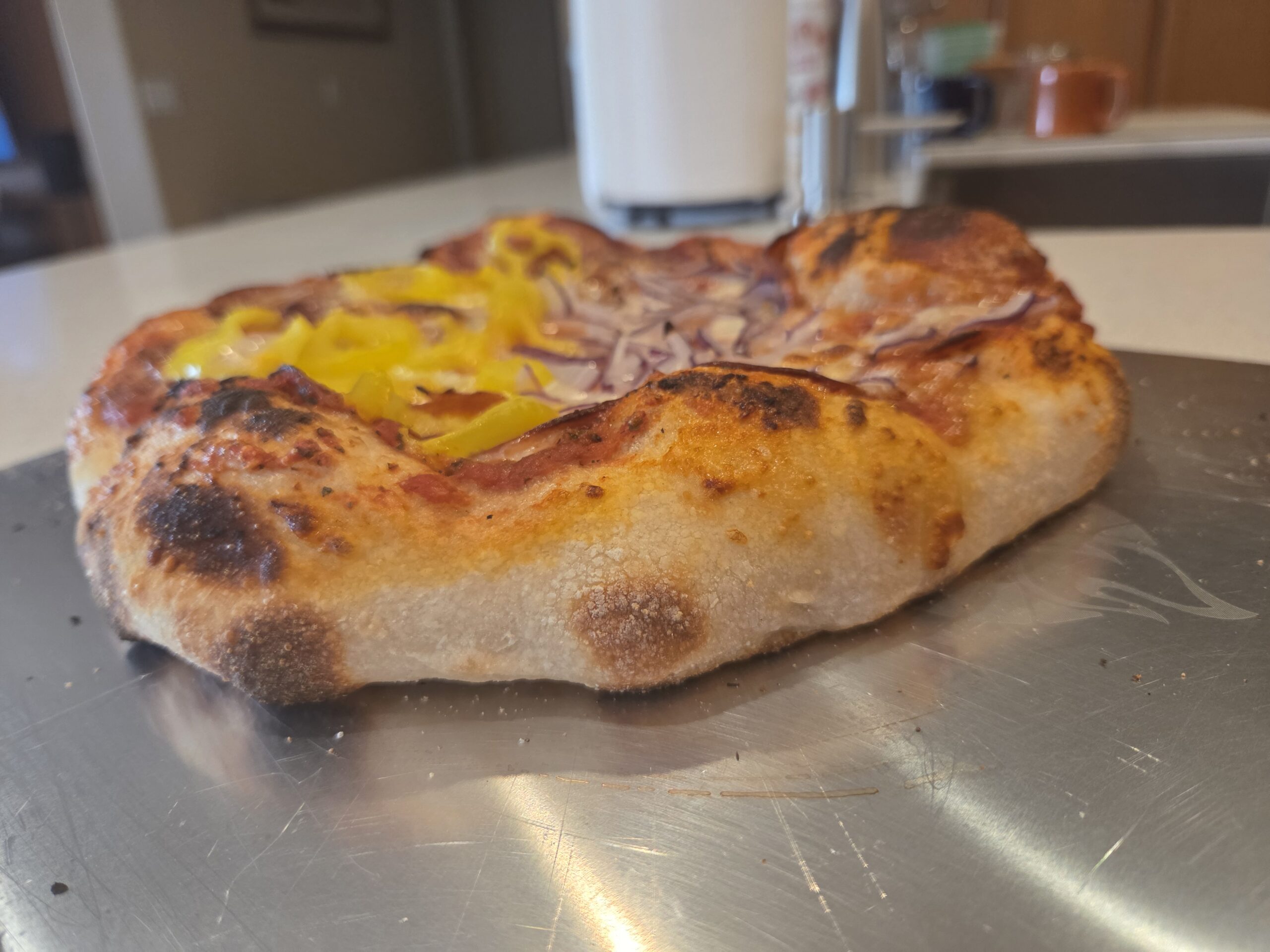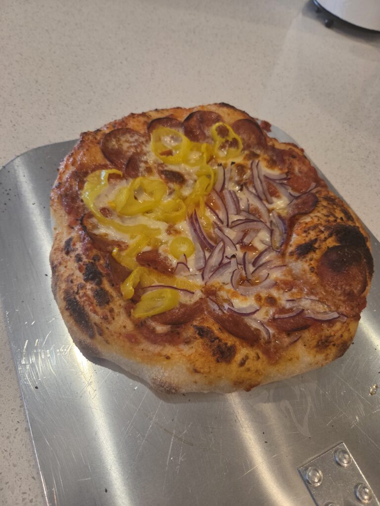 We like the wood fired pizza. A lot. This is just pepperoni and half banana peppers and half red onion. SO GOOD! It’s just Cheryl and I, and we simply make the pizza a little smaller to increase the bubbles at the edge, which is SO GOOD dipped into honey after the rest of the pizza is consumed. This was about 10″ diameter and is perfect for the two of us.