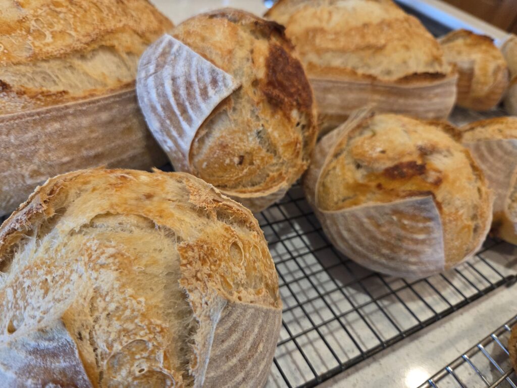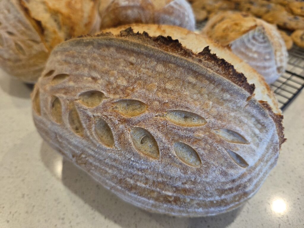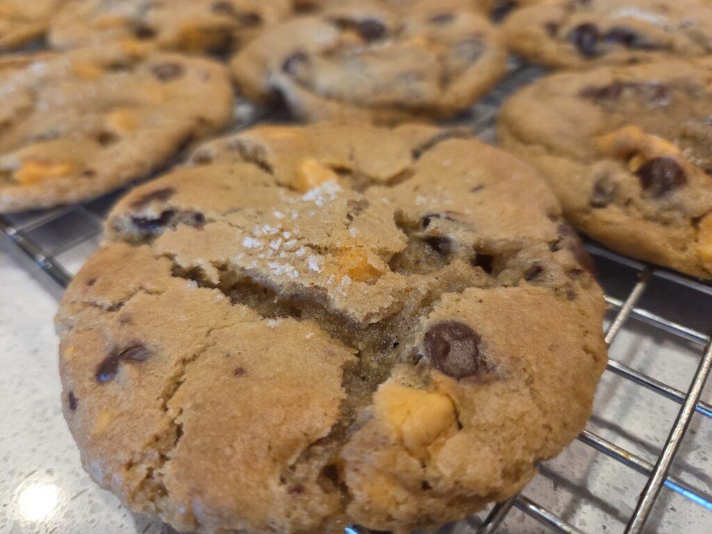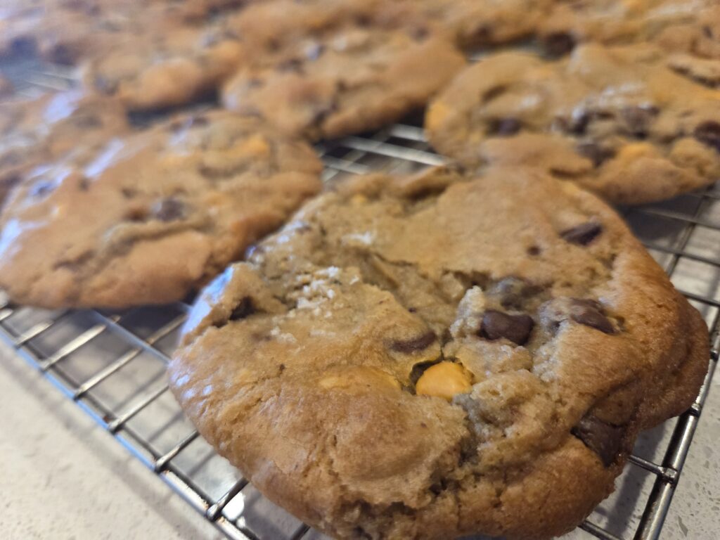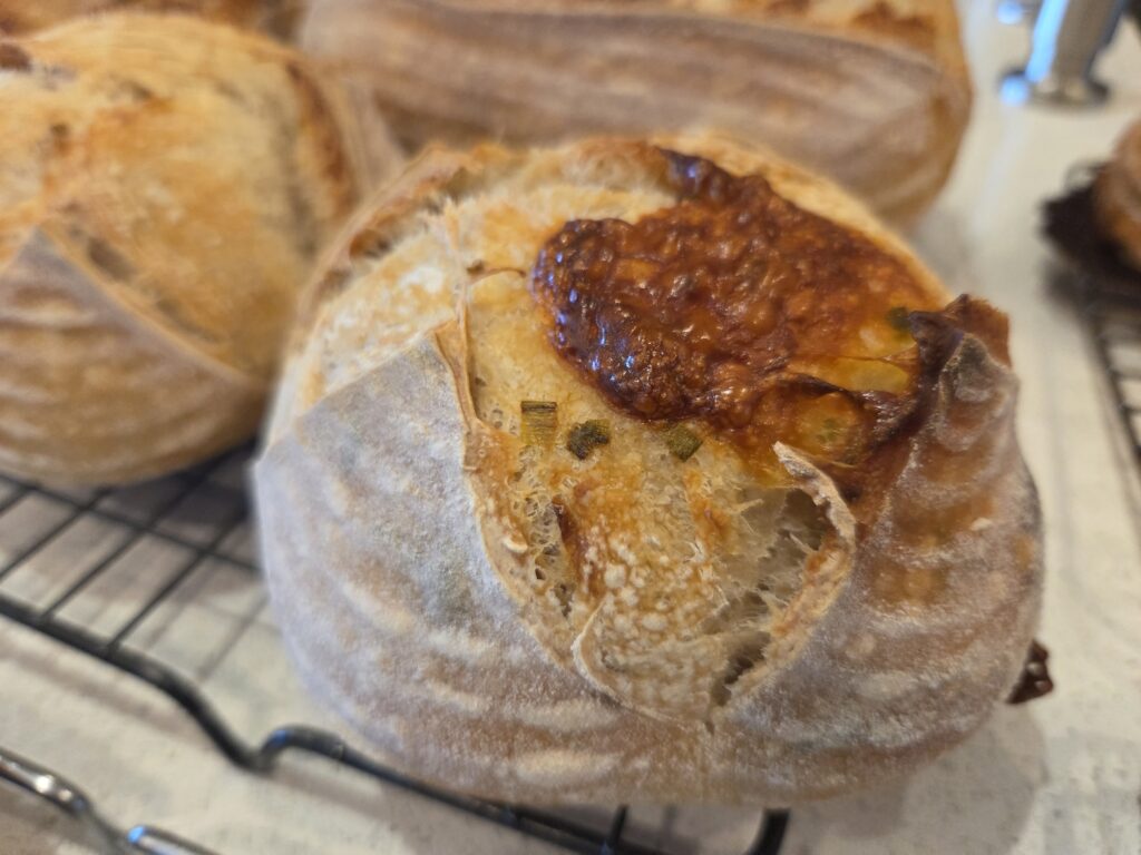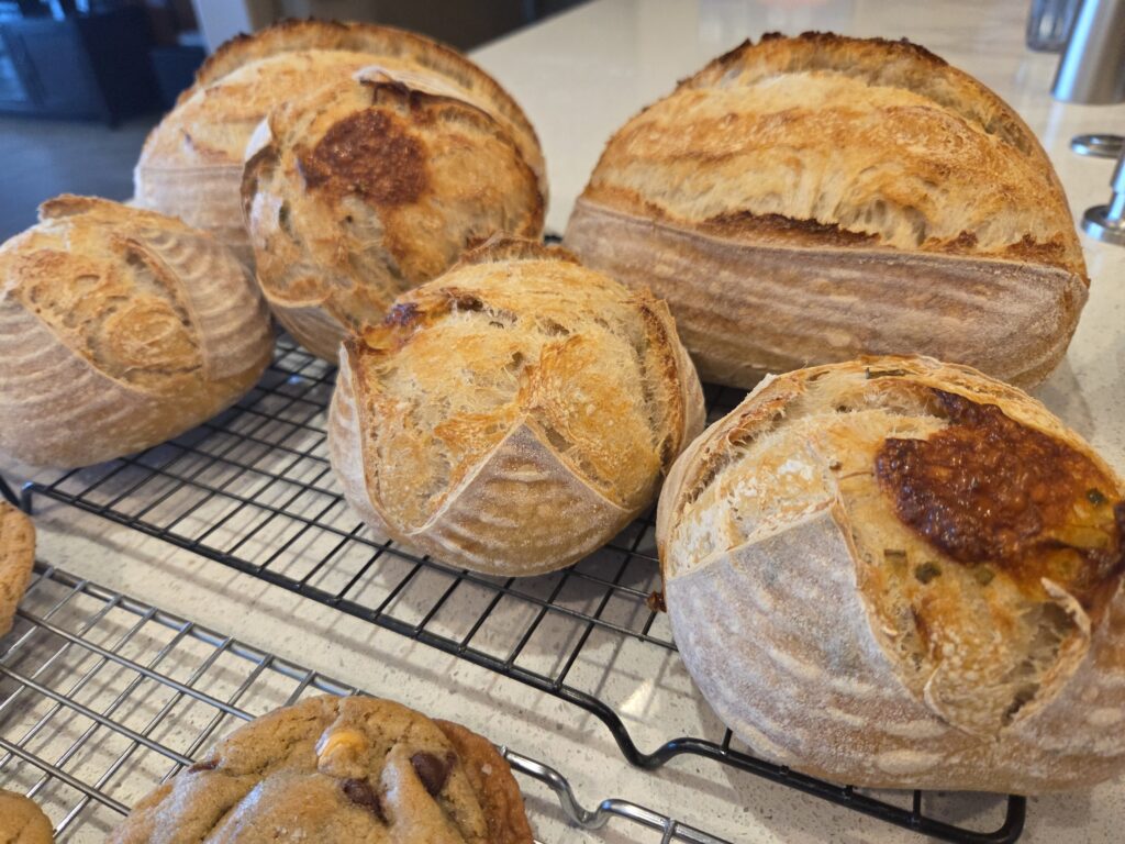 The bake is complete and I have extras! I have one regular loaf, two Green Onion/Pepperjack Cheese minis, and a dozen baked Butterscotch/Chocolate Chip Sourdough cookies still available. I also have an additional 2 dozen of the Butterscotch/Chocolate chip cookies frozen and ready to be baked in your own oven. Reach out if you’d like some goodness!